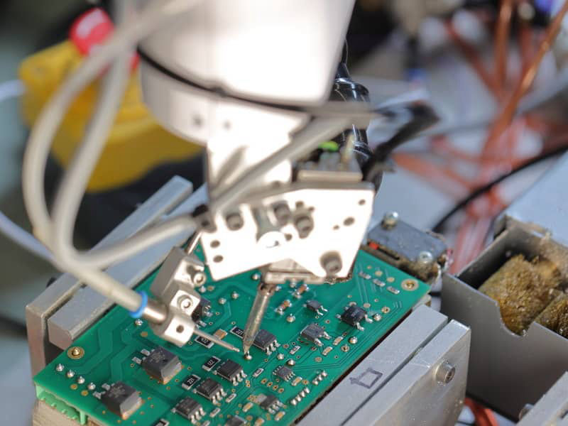 Un robot équipé d'un fer à souder va venir souder les composants traversants.
